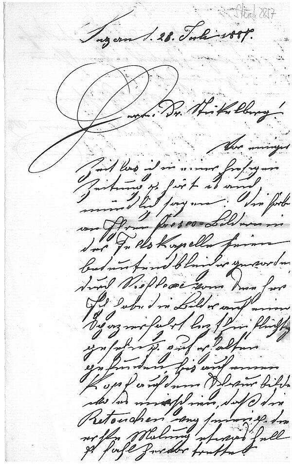 Die Überraschung war gross, als das Schweizerische Institut für Kunstwissenschaften (SIK-ISEA) in Zürich auf Anfrage antwortete, dass im Nachlass von Ernst Stückelberg insgesamt sieben Briefe Stirnimanns an den Basler Kunstmaler vorhanden seien.[1] Damit war erstmalig ein kleines Konvolut von Korrespondenz aus der Feder des Luzerner Hinterländers entdeckt.